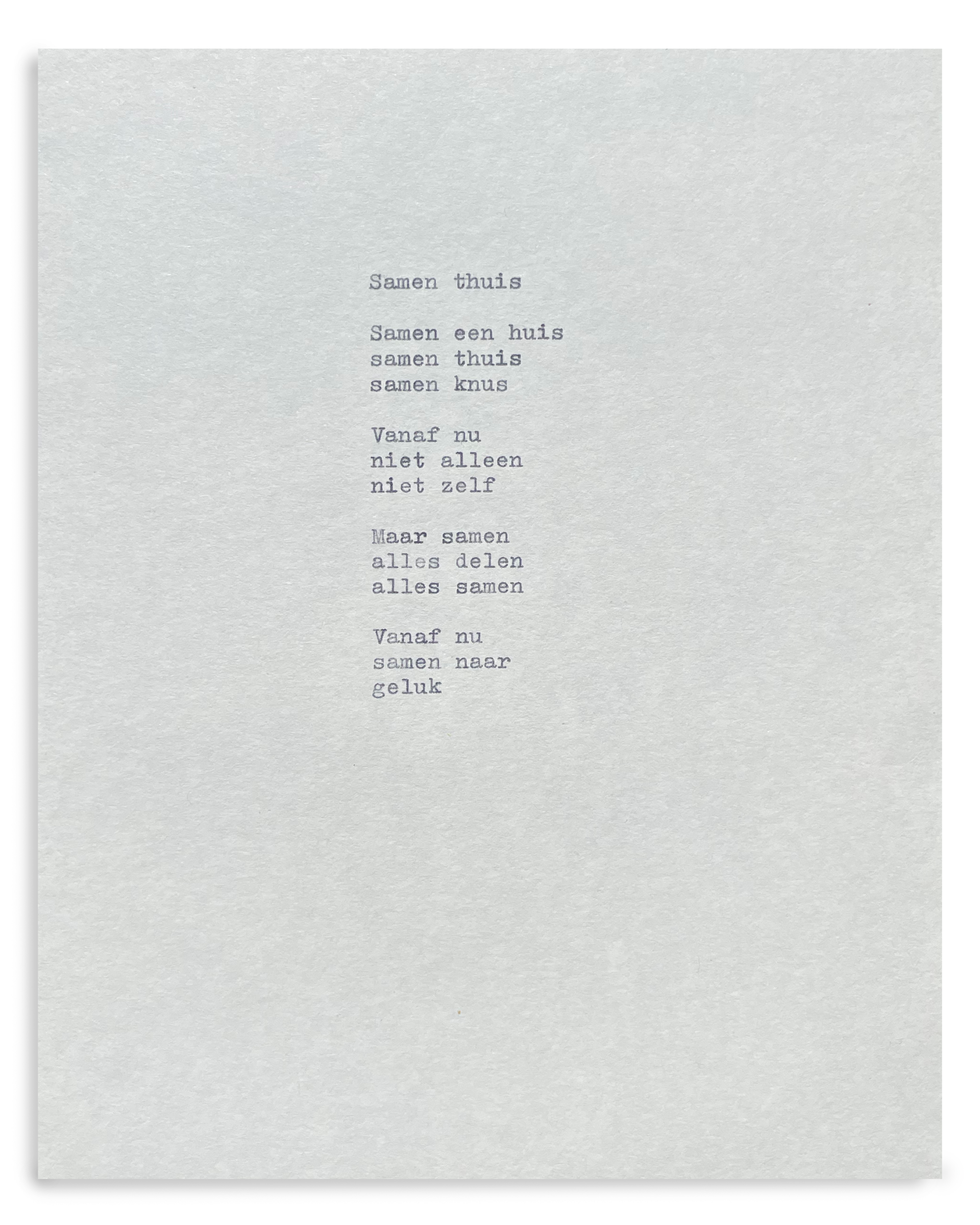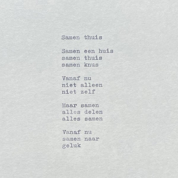 Dit handgetypte gedicht gaat over samenwonen en is uitgewerkt op een typemachine op 90 grams Kasaka papier. De eenvoudige vormgeving met gebroken wit papier en zwarte inkt zorgt voor een rustige en tijdloze uitstraling. Het werk past goed in verschillende interieurs, van modern tot persoonlijk en huiselijk. Door het gebruik van de typemachine heeft het gedicht een ambachtelijk karakter. Een subtiel en persoonlijk kunstwerk dat je kunt ophangen of neerzetten.
